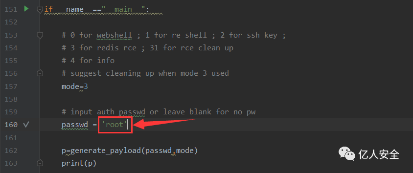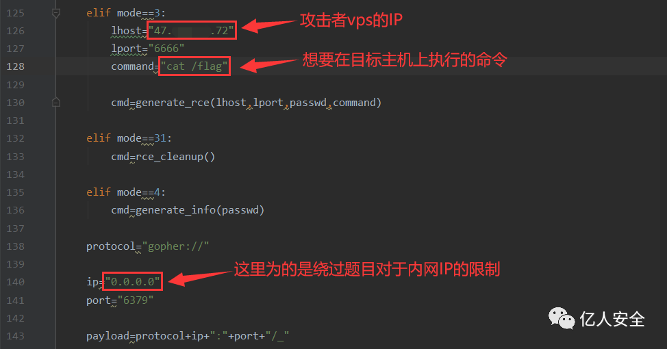 如上图所示,通过选择不同的mode选项可以选择不同的攻击方式。这里我们选择mode 3,通过主从复制在目标主机上执行命令。需要修改一下几个地方: