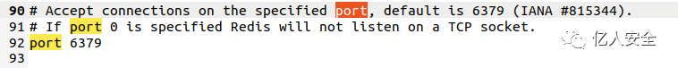 Redis 默认监听的端口为 6379,为了更好地隐藏服务,我们可以在 redis.conf 中修改 Redis 的监听端口。找到包含 port 的行,将默认的 6379 改为其他自定义的端口号,然后重启 Redis。