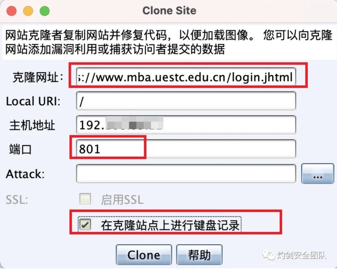 克隆网址可以是http和https的URL,勾选在克隆站点上进行键盘记录,端口也要更改一下