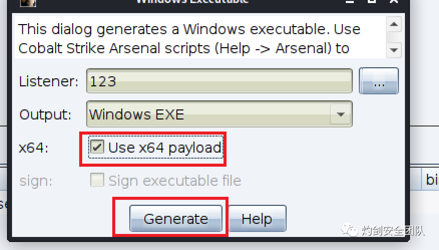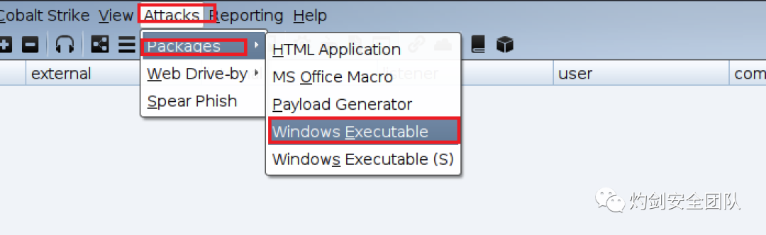 生成windows executable后门木马,点击攻击->生成后门->windows executable