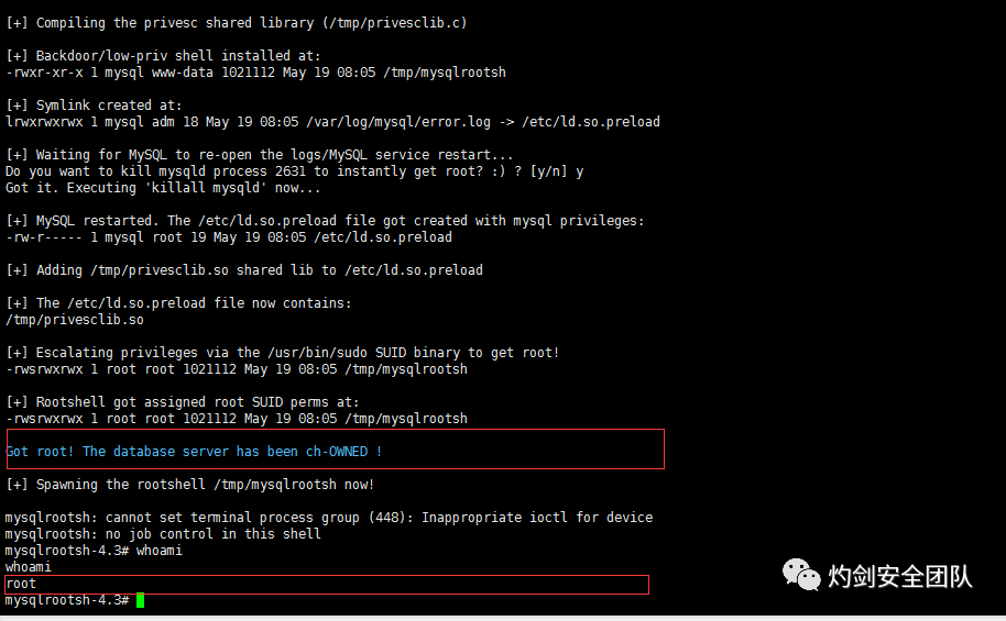 cd var/www/html/gcc mysql-privesc-race.c -o mysql-privesc-race -I/usr/include/mysql -lmysqlclient./mysql-privesc-race test 123456 localhost testdb