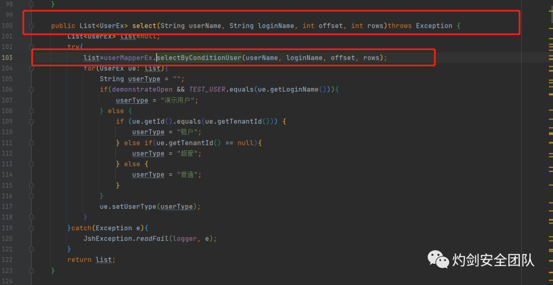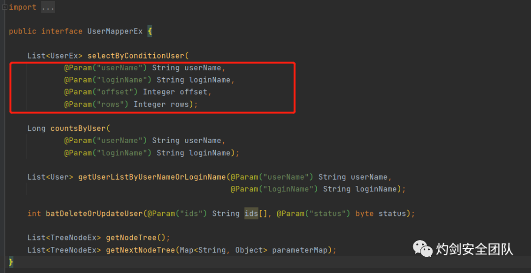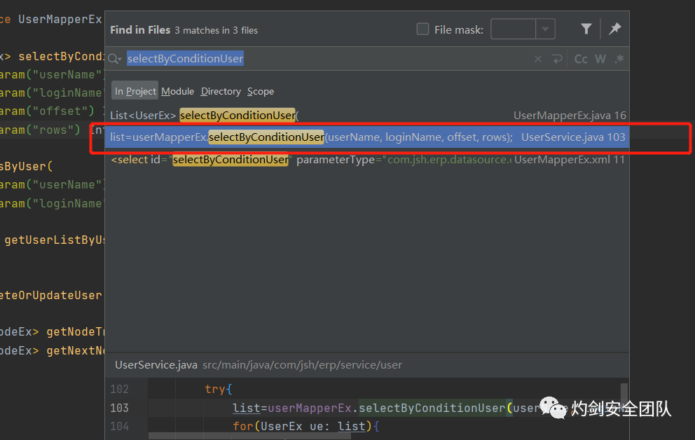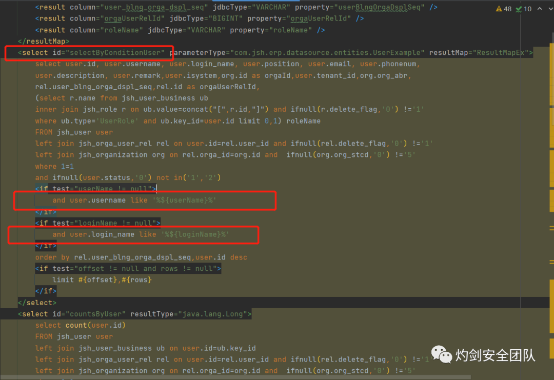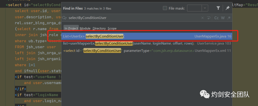 这里使用了不安全的拼接的模糊查询,继续搜索selectByConditionUser