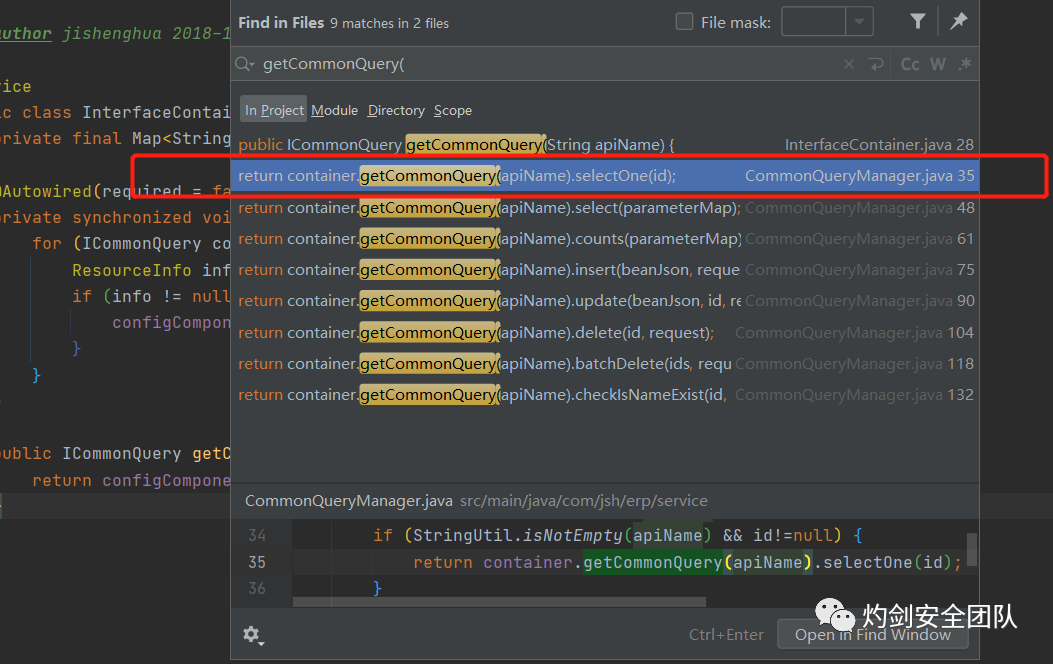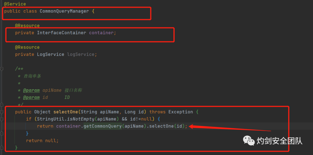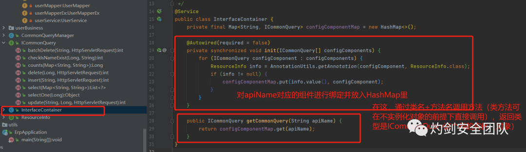 该段代码逻辑:调用init() 初始化函数 ,将service组件放入configComponentMap中,再调用getCommonQuery方法根据传进来的apiName获取对应的service组件。
