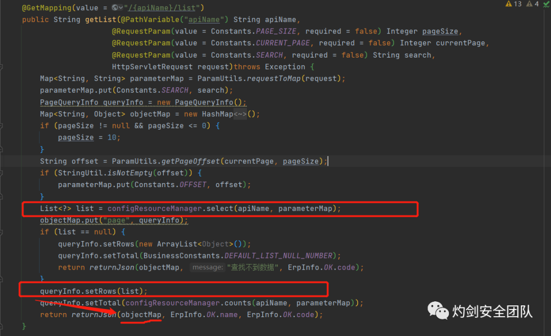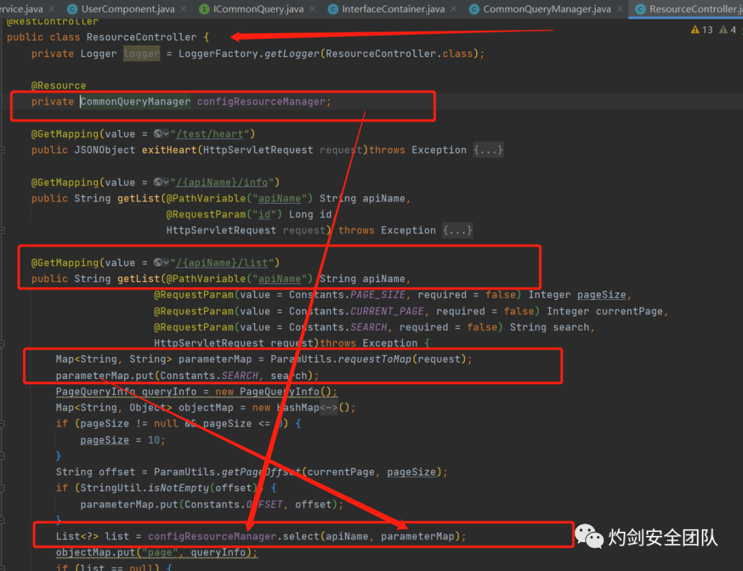 上述代码逻辑:实例化CommonQueryManager类的一个对象configResourceManager去调用select方法,传入apiName与paramterMap。