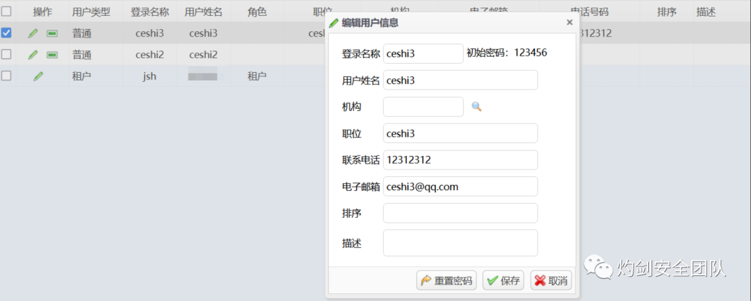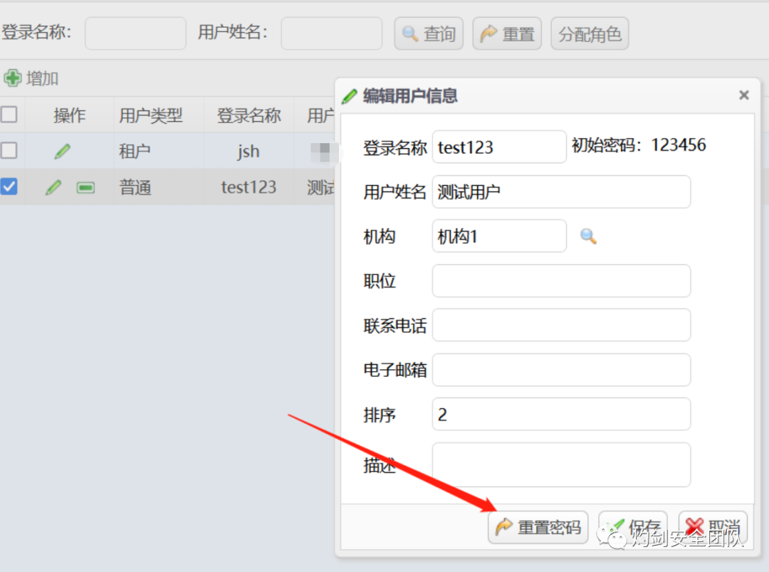 漏洞位置:系统管理>用户管理>选择用户>重置密码