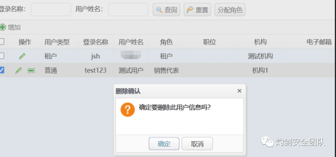 漏洞位置:系统管理>用户管理>选择用户>删除用户信息