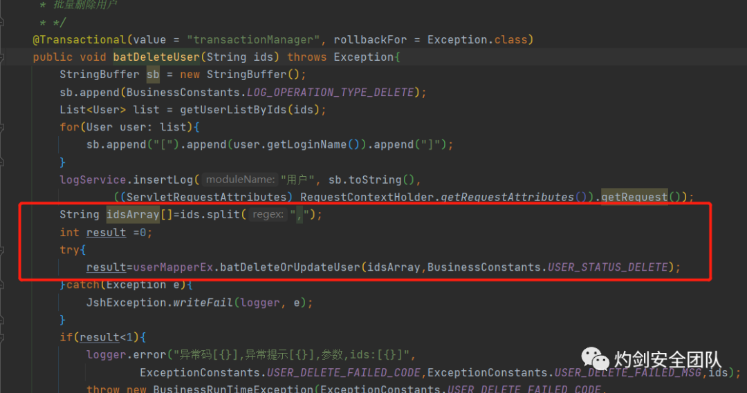 方法的具体实现:传入ids参数,使用,分割,接着调用batDeleteOrUpdateUser方法将ids参数拼接到sql语句中,没有对当前用户身份做判断就进行删除。