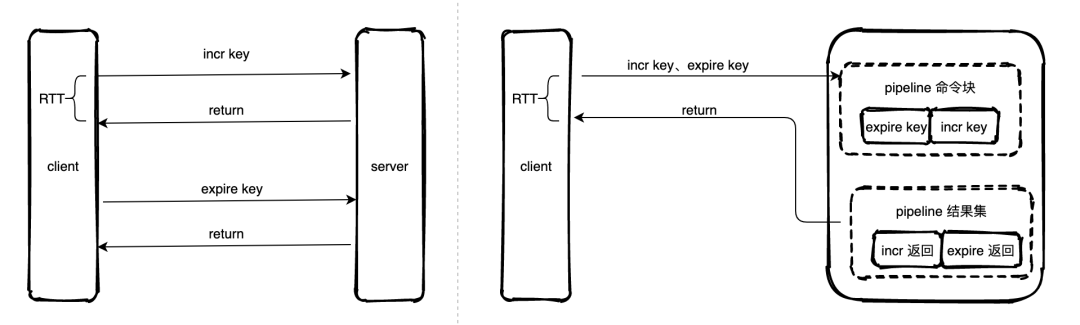 这样我们发现整个过程需要两个RTT。一般我们生产环境都是用的连接池,在连接池有足够的连接的时候,可能我还不需要去创建新的连接,这样就省了TCP三次握手的开销,当需要创建新的连接的时候,这时候还要去建立连接,整个开销又上去了。针对这种批处理命令,为了减少往返的开销,于是管道Pipeline诞生了,通过管道我们可以把两条命令合并发送:# 伪代码