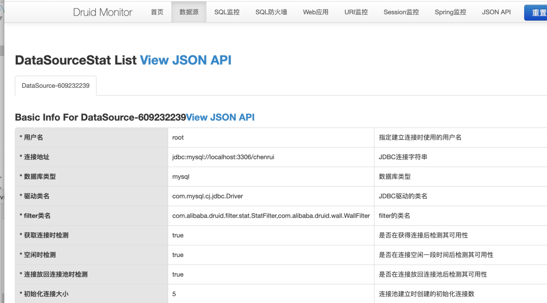 default、stat、wall等是filter的别名,可以在application.properties中可以通过spring.datasource.druid.filters属性指定别名来开启相应的filter,也可以在Spring中通过属性注入方式来开启,接下来介绍一下比较常用的filter
