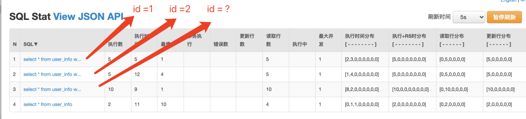 这里你可能会有疑问 ,id =1和id=2怎么还是分开的,如果我id有一亿个,难道要在监控页面上有一亿条记录吗?不是应该都应该是id=?的形式吗?这里后面会讲到,涉及到sql合并的监控配置