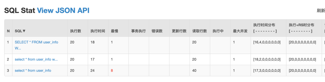 SQL监控项上,执行时间、读取行数、更新行数都有区间分布,将耗时分布成8个区间: