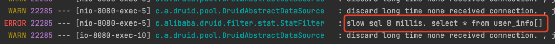 spring.datasource.druid.connection-properties=druid.stat.mergeSql=true;druid.stat.slowSqlMillis=2;druid.stat.logSlowSql=true