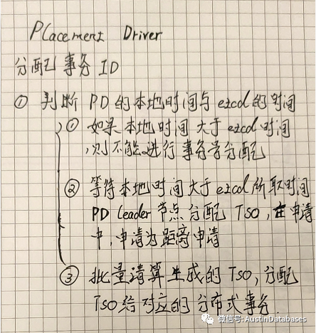 3 分布式数据库中考虑问题需要考虑并发和单位时间事务量的问题, 这里PD 建立TSO 进行了性能优化 , 针对申请进行了时间段的申请, 不是即时分配事务TSO,而是提前申请,将一段时间设置为申请的段,申请后,直接生成TSO,事务在高并发执行是,不会在计算TSO,而是直接给出已经计算好,并且在内存中存储的TSO 给申请的事务即可.
