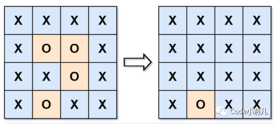 此题为LeetCode算法第130题,示意图如下,要求将所有被'X'包围的'O'同化为'X'。