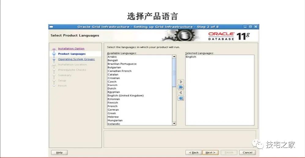此时将显示“Select Product Languages(选择产品语言)”页。要将一种语言添加到安装中,单击该语言将其突出显示,然后使用向右箭头按钮将其移至“Selected Languages(所选语言)”列表。按住Ctrl键的同时,单击鼠标可以选择多种语言。单击“Next(下一步)”按钮继续安装。