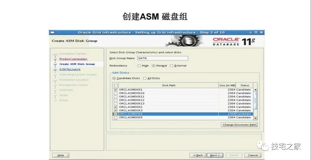 此时将显示“Create ASM Disk Group(创建ASM 磁盘组)”页。Oracle Grid Infrastructure 支持ASM 和Oracle Restart。只有创建了ASM 磁盘组后,OUI 才会继续运行。在“Disk Group Name(磁盘组名)”字段中输入要创建的第一个ASM 磁盘组的名称。如果“Add Disks(添加磁盘)”部分未填入候选磁盘,请单击“Change Discovery Path(更改搜索路径)”按钮,然后输入ASM 磁盘的磁盘搜索路径。对于大多数环境,Oracle 建议创建两个磁盘组。但是,此时OUI 只能创建一个ASM 磁盘组。您可以在安装结束后使用ASMConfiguration Assistant (asmca) 实用程序或SQL*Plus创建推荐的第二个ASM 磁盘组。单击“Next(下一步)”按钮继续安装。注:示例中的列表之所以显示这些设备,是因为配置了ASMLib。ASMLib 只适用于Linux 平台。在其它平台上,可能需要单击“Change Discovery Path(更改搜索路径)”按钮。