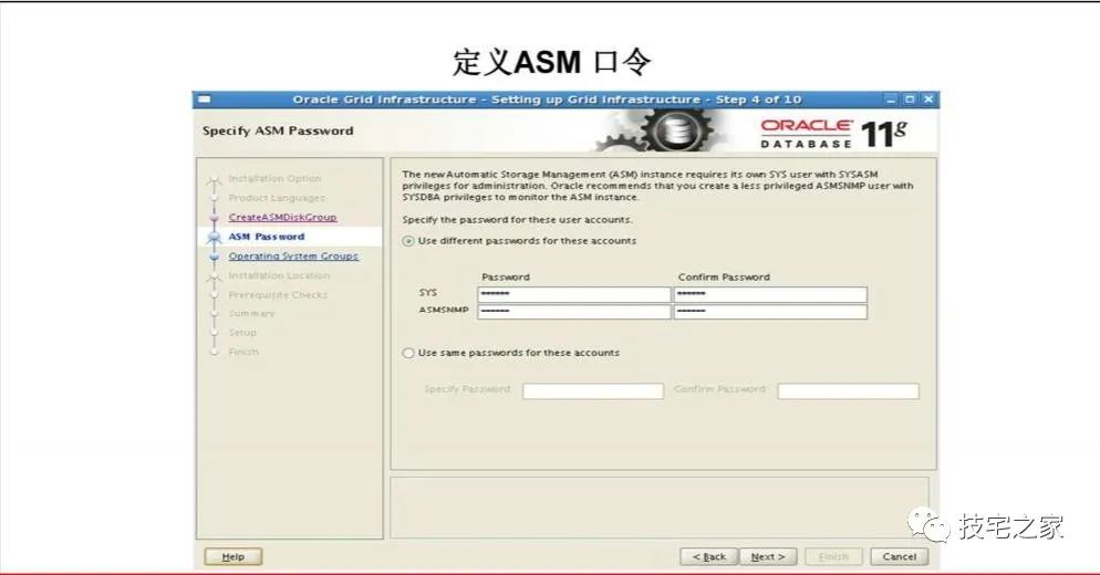 此时将显示“Specify ASM Password(指定ASM 口令)”页。必须提供两个帐户的口令:SYS 帐户和ASMSNMP 帐户。您可以选择对这些帐户使用不同的口令,也可以选择使用同一个口令。与Oracle DB 不同,ASM 实例不含数据字典,因此只有操作系统验证和口令文件验证这两种验证方法。SYS 帐户会添加到口令文件中(在Linux 上为orapw+ASM),并授予SYSDBA、SYSOPER 和SYSASM 权限。ASMSNMP 帐户会添加到口令文件中,但只授予SYSDBA 权限。输入相应的口令后,单击“Next(下一步)”按钮继续安装。