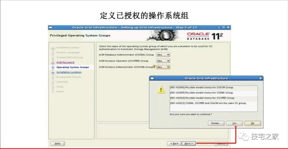 因为此安装针对的是独立服务器,因此通常的做法是三个组都使用同一个操作系统组,如dba。单击“Next(下一步)”按钮继续安装。由于OSDBA、OSOPER 和OSASM 使用同一个操作系统组,所以会显示警告,对此请单击“Yes(是)”。