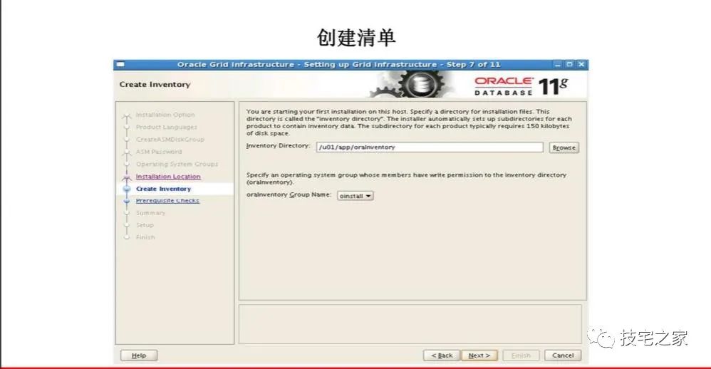 如果主机上还没有Oracle 主产品清单目录,则将显示“Create Inventory(创建清单)”页。对于“Inventory Directory(清单目录)”字段,为oraInventory 目录输入所需位置。推荐的目录为/u01/app/oraInventory。oraInventory 目录应该比ORACLE_BASE 目录高一级。从选择列表中选择oraInventory 组名称。推荐的名称为oinstall。单击“Next(下一步)”按钮继续安装。