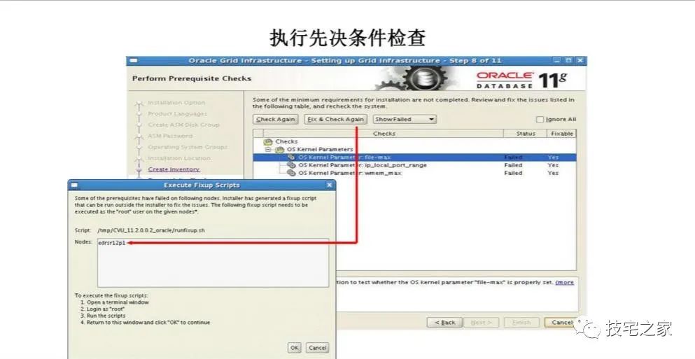 此时将显示“Perform Prerequisite Checks(执行先决条件检查)”页。除非由于出错而未通过某些检查,否则无需在此页上执行任何操作。如果确实出错,需要在继续安装之前将其纠正。在幻灯片示例中,有一些内核参数没有通过先决条件检查。系统指示您运行一个脚本来纠正这些内核参数,然后重新运行检查。如果是无法修复的错误,您必须手动修复该问题或者选择“Ignore All(全部忽略)”,然后继续安装(如果未通过的那项检查不是关键检查)。注:并非所有故障都能使用OUI 生成的runfixup.sh 脚本来修复。在这种情况下,需要手动干预来纠正问题,然后才能重新尝试安装。
