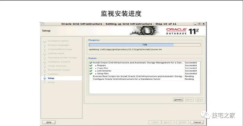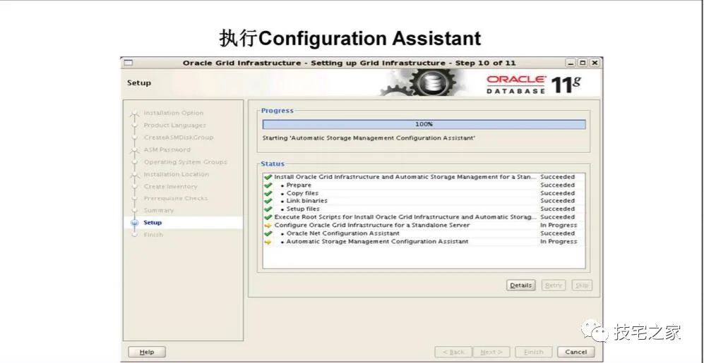执行Configuration Assistant采用无提示安装方法时,将调用Oracle Net Configuration Assistant (netca) 来创建网络配置文件,随后Automatic StorageManagement Configuration Assistant (asmca) 将创建ASM磁盘组并在Oracle Restart 中注册ASM 组件。