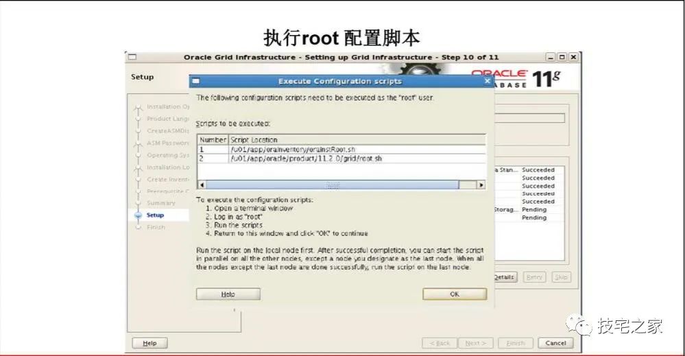 接下来将显示“Execute Configuration Scripts(执行配置脚本)”对话框页,显示需要以root 用户身份执行的配置脚本。orainstRoot.sh 脚本负责更改Oracle 主产品清单目录的权限,即添加组的读写权限,同时删除world 用户的读写和执行权限。root.sh脚本将文件复制到/usr/local/bin 目录中,创建/etc/oratab 文件,创建grid用户的OCR 注册表项,启动ohasd 守护程序,并修改/etc/inittab 以便在计算机启动时自动启动ohasd 守护程序。执行root 脚本后,单击“OK(确定)”按钮返回到“Setup(安装)”进度页继续安装。