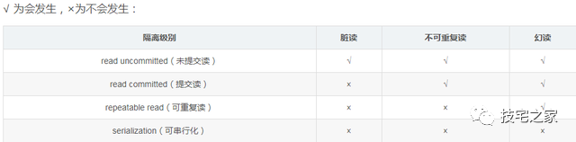脏读(dirty read):B 事务更改数据还未提交,A 事务已经看到并且用了。B 事务如果回滚,则 A 事务做错了;不可重复读(non-repeatable read):不可重复读的重点是修改: 同样的条件, 你读取过的数据, 再次读取出来发现值不一样了,只需要锁住满足条件的记录 ;幻读(phantom read):事务 A 先修改了某个表的所有纪录的状态字段为已处理,未提交;事务 B 也在此时新增了一条未处理的记录,并提交了;事务 A 随后查询记录,却发现有一条记录是未处理的造成幻读现象,幻读仅专指新插入的行。幻读会造成语义上的问题跟数据一致性问题;在可重复读 RR 隔离级别下,普通查询是快照读,是不会看到别的事务插入的数据的。因此,幻读在当前读下才会出现。要用间隙锁解决此问题。在说隔离级别之前,你首先要知道,你隔离得越严实,效率就会越低。因此很多时候,我们都要在二者之间寻找一个平衡点。SQL 标准的事务隔离级别由低到高如下: