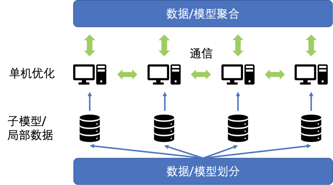整体上说,分布式机器学习系统需要将大模型或是大数据划分,再分配到不同的机器上进行计算优化,单机的优化结果再通过通信模块进行汇总。不同的系统也根据不同的场景和目标对如何划分模型/数据,单机如何计算优化,如何通信,如何聚合进行了调整,如图3所示。
