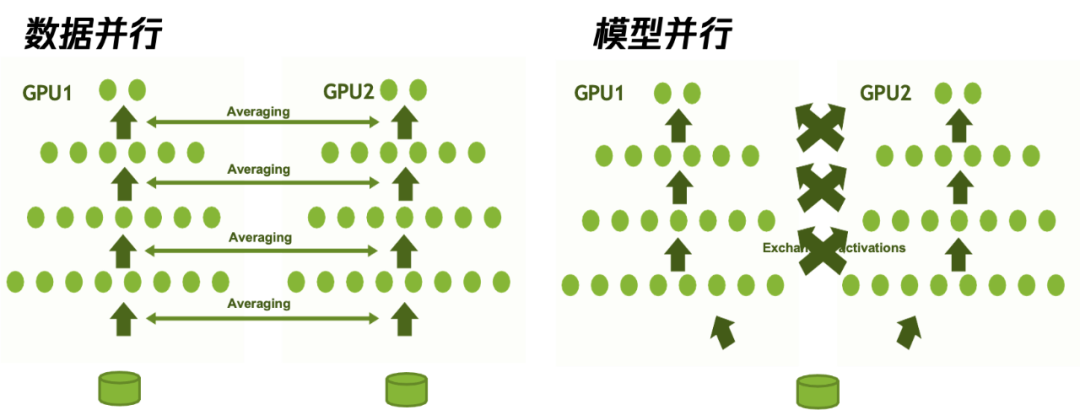 通常而言,数据并行的目的是为了加速训练,而将原始数据分配到不同的worker上并行训练。其中,每一个worker使用不同的部分数据,但是都拥有完整的模型(否则就是模型并行),woker之间一般会同步自己的局部梯度信息,再进行汇总,得到整体的更新结果。而模型并行则有所不同,其一般是由于模型太大,单机无法储存,而采取的将模型的不同部分放在不同的worker上进行训练的方式,常用的方式是每一个worker均使用相同的数据,但是只使用模型的一部分来进行,如图4所示。本文后续所陈述的内容大多以数据并行的视角为主。