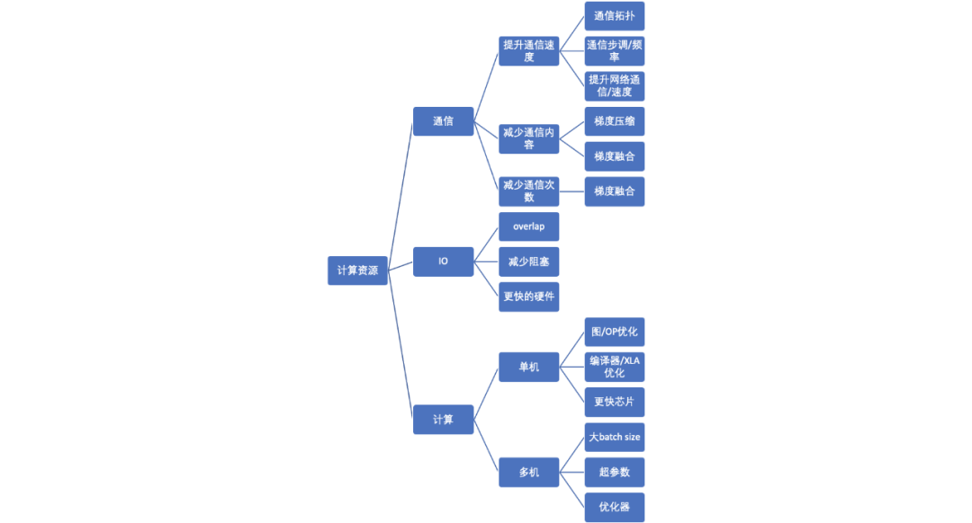 业界和学界也是在这些方面进行了优化,下图展示了其中的部分内容,通信上,一方面提升通信速度,比如通信拓扑的改进,通信步调和频率的优化,另一方面也可以减少通信内容和次数,比如梯度压缩和梯度融合技术等。IO上,通过代码优化,减少IO的阻塞,尽量使得IO与计算可以overlap。计算上,一方面,可以进一步地优化单机的计算性能,比如图/OP优化,编译器优化等,另一方面,分布式带来了大batch size上的优化问题,又需要解决。当然,这些方面的问题,都或多或少的可以在硬件层面进行一定的优化,比如更大的带宽,降低通信延迟,本文后续不对硬件部分进行讨论,上面所说的优化路径汇总如图5所示。