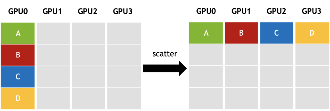 Scatter的方式中,有一个发送方,多个接收方,但是发送方中的数据会被切分,然后分散在各个接受方中去,如图8所示。