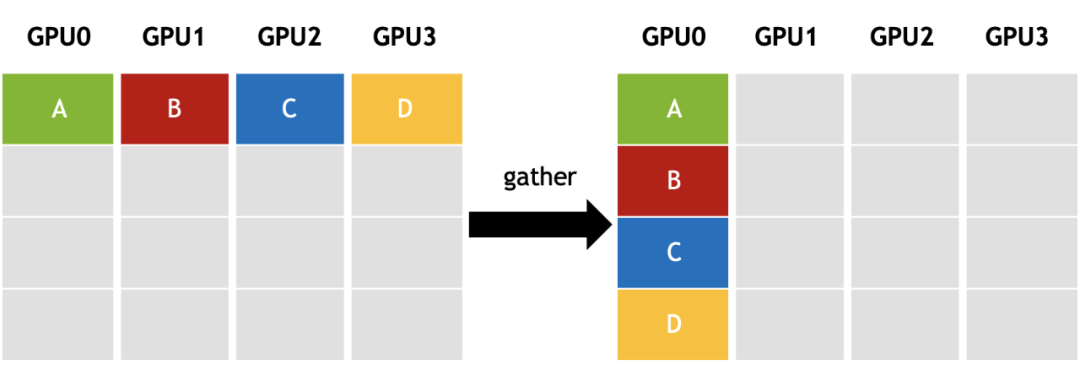 Gather的方式中,有多个发送方,一个接收方,其是Scatter的反过程,将分散在各个发送方中的数据汇总集中到一个接受方中去,如图9所示。