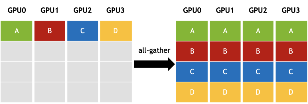 All-Gather的方式,则是在Gather的基础上更进一步,不仅汇总了信息,还将此信息发送给所有接受方。如图10所示。