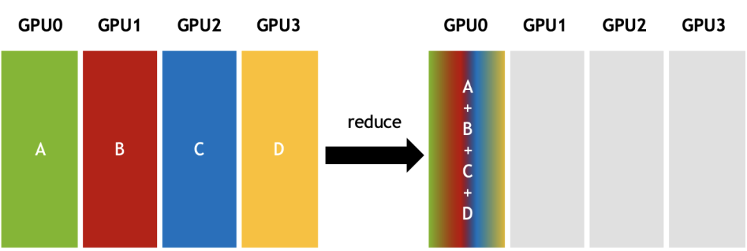 Reduce的方式中,有多个发送方,一个接受方,其是合并来自所有发送方的数据,再将结果传递给接收方,如图11所示。