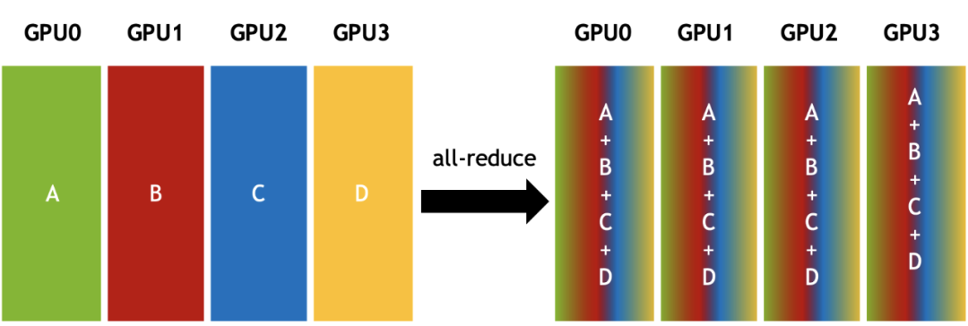All-Reduce又在Reduce的基础上进一步地将合并后的数据发送给了所有的接收方,如图12所示。