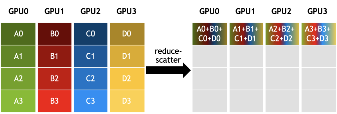 Reduce-Scatter则是一方面合并来自所有发送者的数据,另一方面又在参与者之间分配结果,如图13所示。
