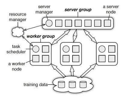 ps-lite的主要架构示意图如图14所示。其中,resource manager用来对当前的各个计算资源进行管理,可以直接利用资源管理组件如yarn、mesos或者k8s来实现,而底下的training data就是用来采集训练数据,在大规模场景下,一般需要类似GFS的分布式文件系统的支持,剩下的server group和worker group部分就是参数服务器的核心组件了。