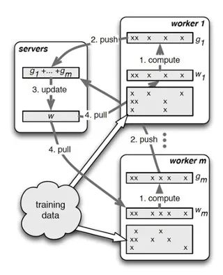 参数服务器的概念最早大概可以追溯到Alex Smola于2010年提出的并行LDA的框架,其采用一个分布式的Memcached作为存放参数的存储,用于在分布式系统不同的Worker节点之间同步模型参数,而每个Worker只需要保存它计算时所依赖的一小部分参数。