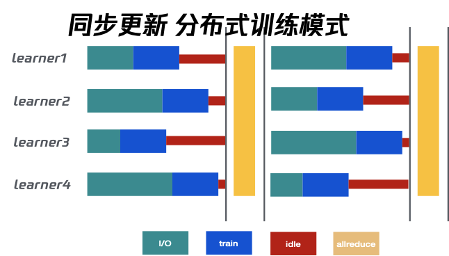 机器学习系统中,通常需要先加载处理样本,再利用样本进行训练,当样本不够时,会阻塞等待,batch size变大时,其阻塞时间也会变长,如图23所示。更进一步地,多leaner分布式训练时,同步训练的整体进度会由最慢的learner决定(木桶效应)。这就使得,如果IO上优化的不好,就会导致大量的昂贵GPU资源空载,算力没有被充分利用,其利用率可能会偶尔到很高,而很多时候在很低的水平,如图22所示。