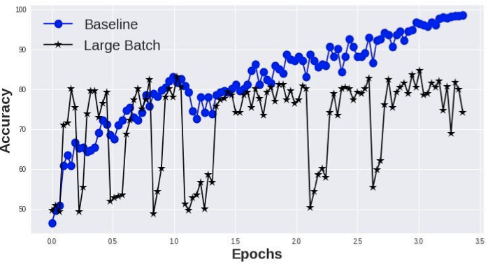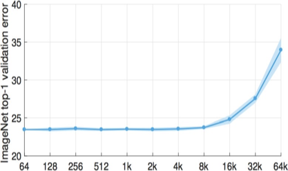 在上部分内容中,关于分布式加速的论述中,只考虑了将样本计算完的时间开销,理想情况下,训练精度不变,也就自然带来了加速。然而,当我们真的直接去利用分布式来加速训练时,不幸的发现,随着batch size的增大,训练出现了明显的精度降低如图28所示。