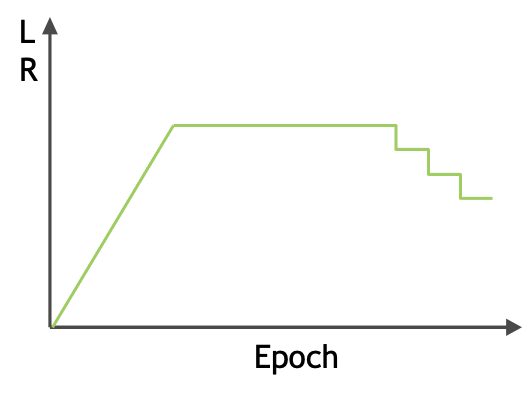第二个是采用了Warmup Rule的技术,其主要的出发点是在经过上述的学习率放大后,在初始训练时,非常容易出现不稳定的现象,导致最后很难收敛。因此,他们在刚开始训练时,仍然从比较小的η开始,再逐渐增大,训练了一定的Epochs以后,再按照上述的kη的方式进行训练。在此之后,也有一些工作在训练的后期逐渐降低学习率,被称之为learning rate decay,也被广泛应用,使得后续训练更加稳定收敛,如图30所示。
