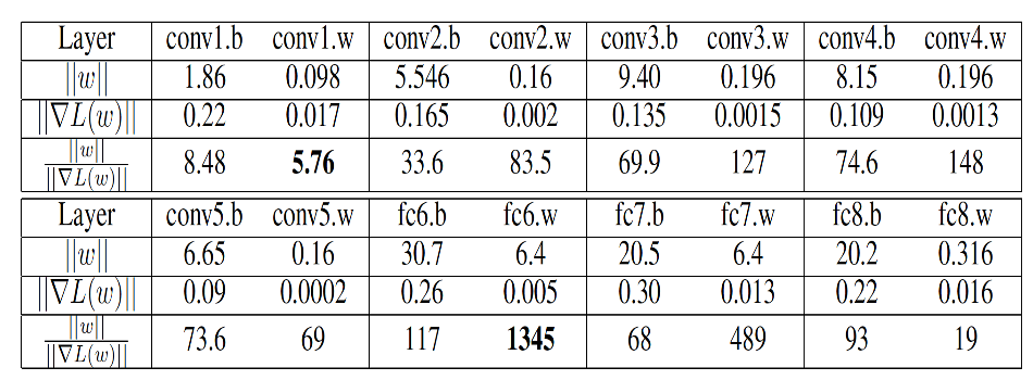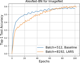 即使在经过了上述优化后,AlexNet模型训练在分布式训练上仍然有比较明显的精度损失,难以解决。其中存在着比较多的原因,一个原因是目前深度学习的参数更新没有考虑不同层的差异。