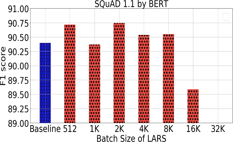 LARS优化器虽然在ImageNet数据集上的训练,以及相应的AlexNet,ResNet上取得了明显成功,使得分布式训练的扩展比大大增加,然而,不幸的事,当将其应用到NLP领域经常使用的Bert模型上时,其扩展比还是不很理想,在batch size增加到8K以后,预测精度明显变差,如图34所示。