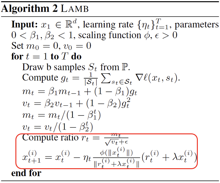 为了进一步地解决这个问题,使得在Bert这样的更大的模型上依然可以提升扩展比,就有了LAMB优化器,如图34所示。可以粗略地认为,其主要是将Adam这样一种针对每个参数计算自适应学习率的方法与LARS这样一种在Layer层次上针对学习率做修正的方法进行结合,算法过程如下图35所示。