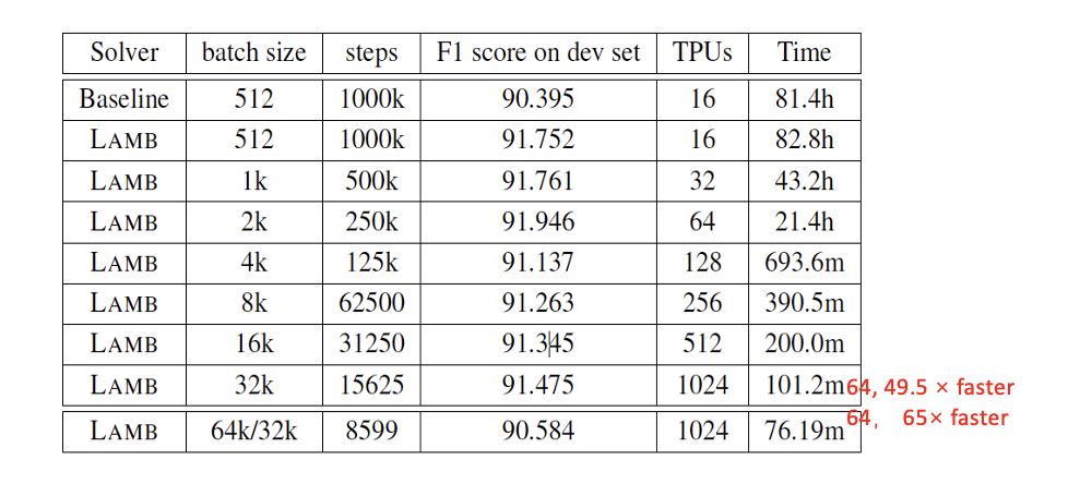 其与Adam算法相比,只有红框内不同,红框内实际上与LARS相似,在做layer-wise的学习率修正,即根据当前layer的参数与参数的梯度的比值进一步使得学习率更加准确。基于LAMB算法,同样地训练Bert,结果如图36所示,当batch size扩大到32K后,精度依然没有明显损失,后续由于硬件上无法继续扩大batch size才没有继续测试。并且,32K的batch size实验中,64倍的资源,获得了49.5倍的加速比,相对于ImageNet的训练加速比会小一些,但是相对于之前的工作也有了显著增加。