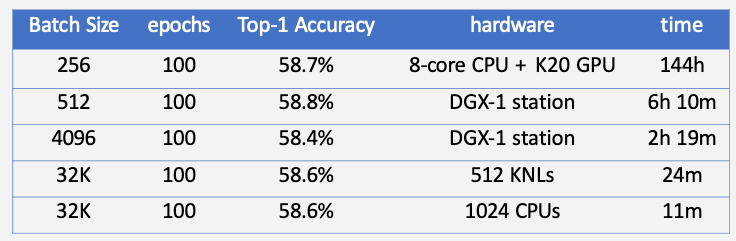 在此之后,各家公司基于LARS优化器,结合其他的各种改动,在ImagetNet数据集上的训练时间不断缩短,世界纪录不断被打破,比如有: