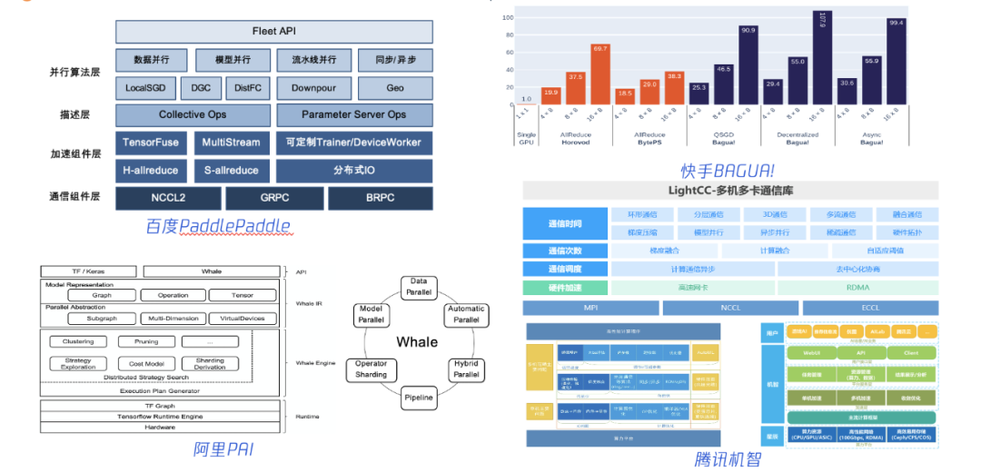 业界在分布式机器学习方面均投入了很多研究和开发人员,在整体的研发路径上覆盖了包括本文内容在内的更加丰富的内容。如图37所示,百度的PaddlePaddle在很多方面进行了优化,通信组件库除了NCCL2外,还增加了GRPC,BRPC等,并且对于通信方式/拓扑,IO以及算子等都进行了加速优化。快手开源的分布式通信库则是期望能够将中心化/去中心化,同步/异步等通信的方式统一起来,并从理论着手证明其收敛性,也在很多数据集的训练上取得了很好的效果。公司内的机智平台也同样在通信,IO,计算等方面均进行了细致的优化,以提升训练速度,并支持了公司内很多业务团队。
