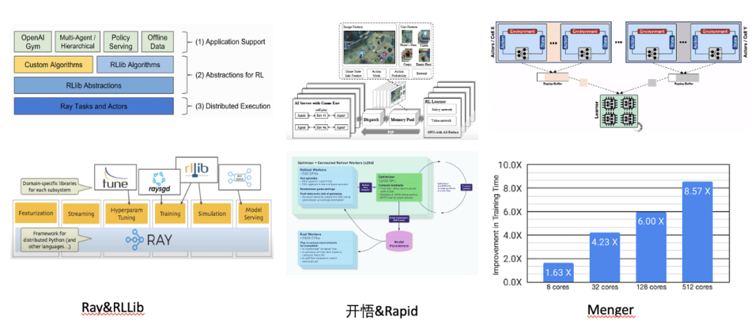 相对于传统的分布式机器(监督)学习系统而言,分布式强化学习系统则更加复杂,其不仅需要考虑如何训练样本,还要考虑如何产生样本,在系统的性能方面会遇到更多的挑战。如图38所示,学界经常使用的是Ray以及基于其封装的RLLib,谷歌的博客上阐述了他们的分布式强化学习系统Menger的系统框架,以及相应的性能数据,但是并未开源。