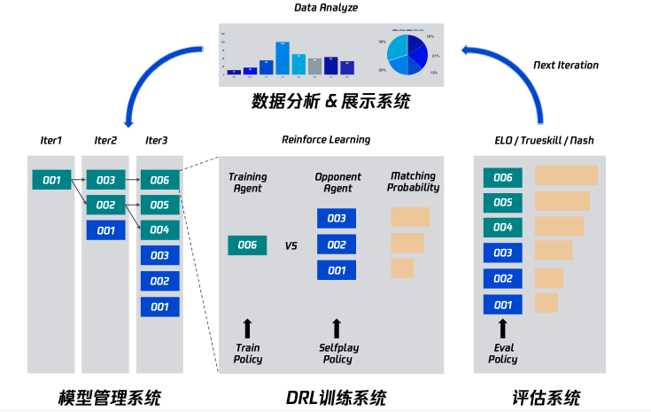 公司内开源的Avatar就是一个大规模分布式强化学习平台,其针对上述各个环节进行了优化,目前在OpenAI的Dota2模型(OpenAI Five)上进行测试,其性能已经达到了业界领先水平,如图39所示,并在继续优化中。同时,其已经支持了公司内各大工作室群的MOBA游戏,FPS游戏,动作格斗游戏,赛车竞速游戏等各品类游戏AI研发,均取得了满意的效果。除了训练系统以外,Avatar上还开发了数据分析/展示系统,模型管理系统,评估系统,上层调度接口,League训练等周边系统,如图40所示,以更好更快地开发游戏AI。